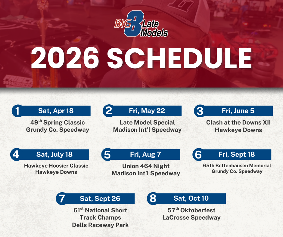 The Big 8 Late Model Series has officially announced its 2026 racing schedule, highlighted by eight marquee events across Illinois, Wisconsin, and Iowa. The upcoming season blends tradition-rich classics with premier regional showcases, continuing the series’ commitment to top-tier late model competition on the Midwest’s most respected short tracks.